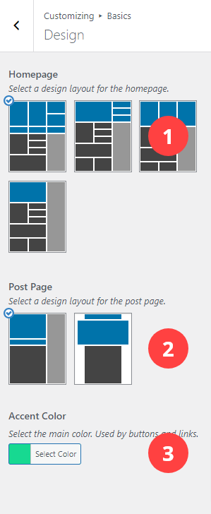 - Homepage: Select a layout for the homepage.