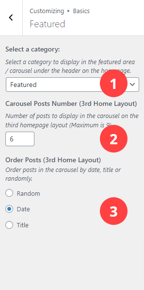 - Order Posts: Order featured carousel posts by date, randomly or by title.