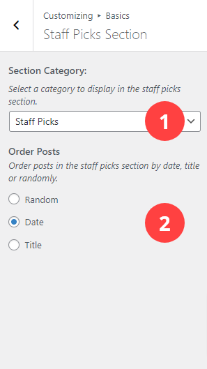 - Section Category: Select a category for the Staff Picks section displayed on homepage layout one only.