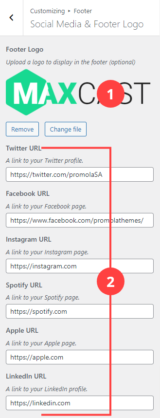 - Social Media Links: Paste links to your social media profiles. These links will be used by the icons in the footer. Icons will not be displayed if no link is provided.